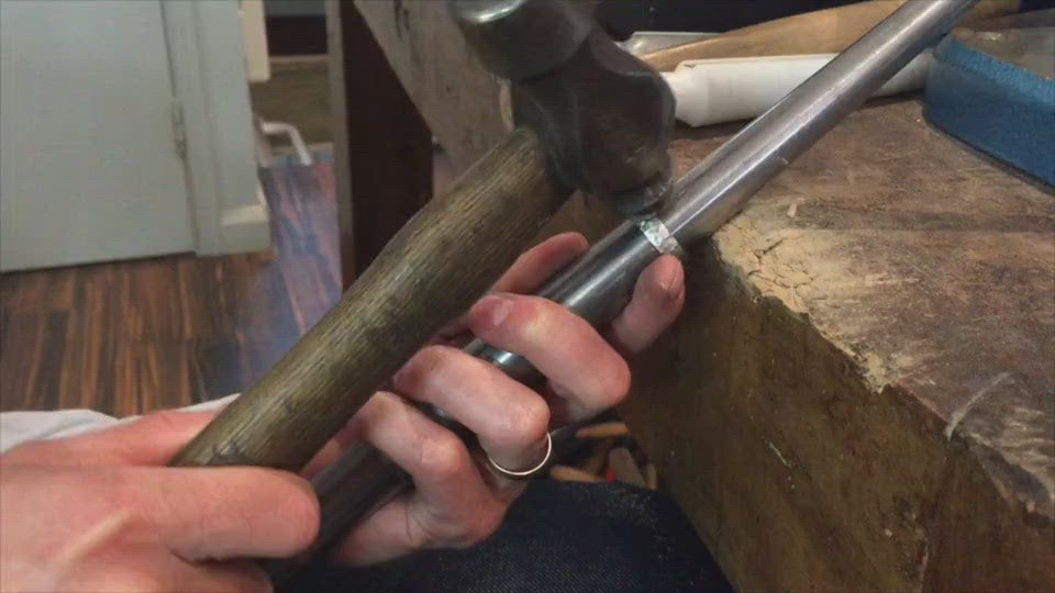 These unisex hammered wedding bands are formed from flat gold or platinum bar, which is hammered before being carefully formed into rings. The outer surface is left with a rough texture which contrasts with the soft curve and high polish of the inside surface.