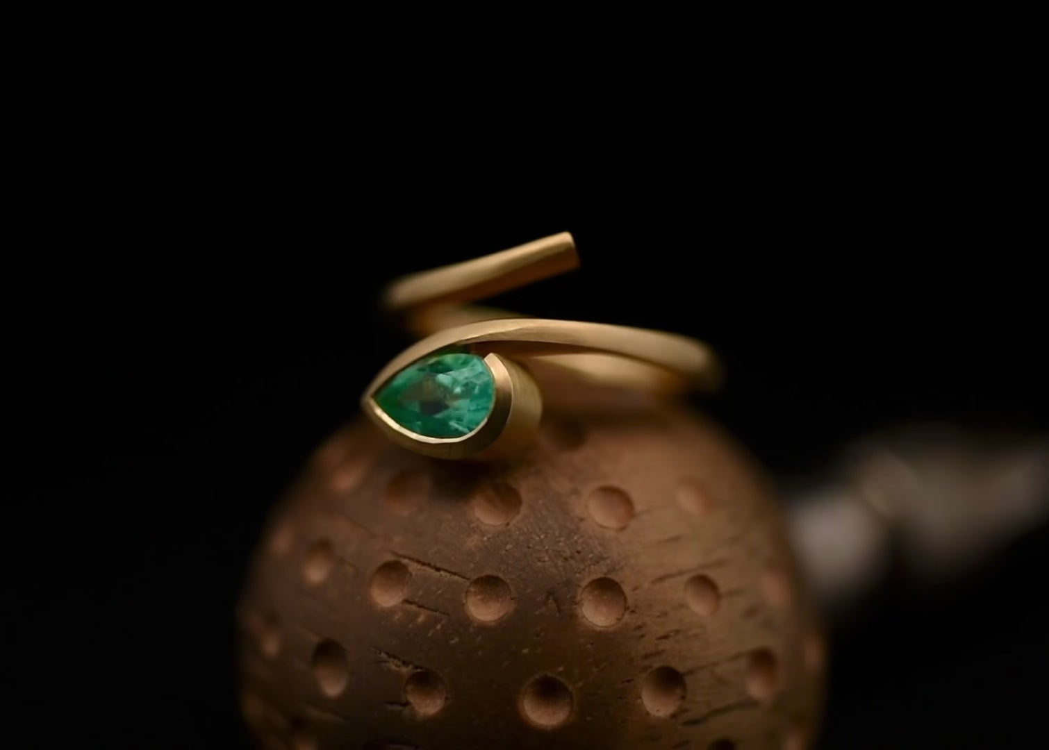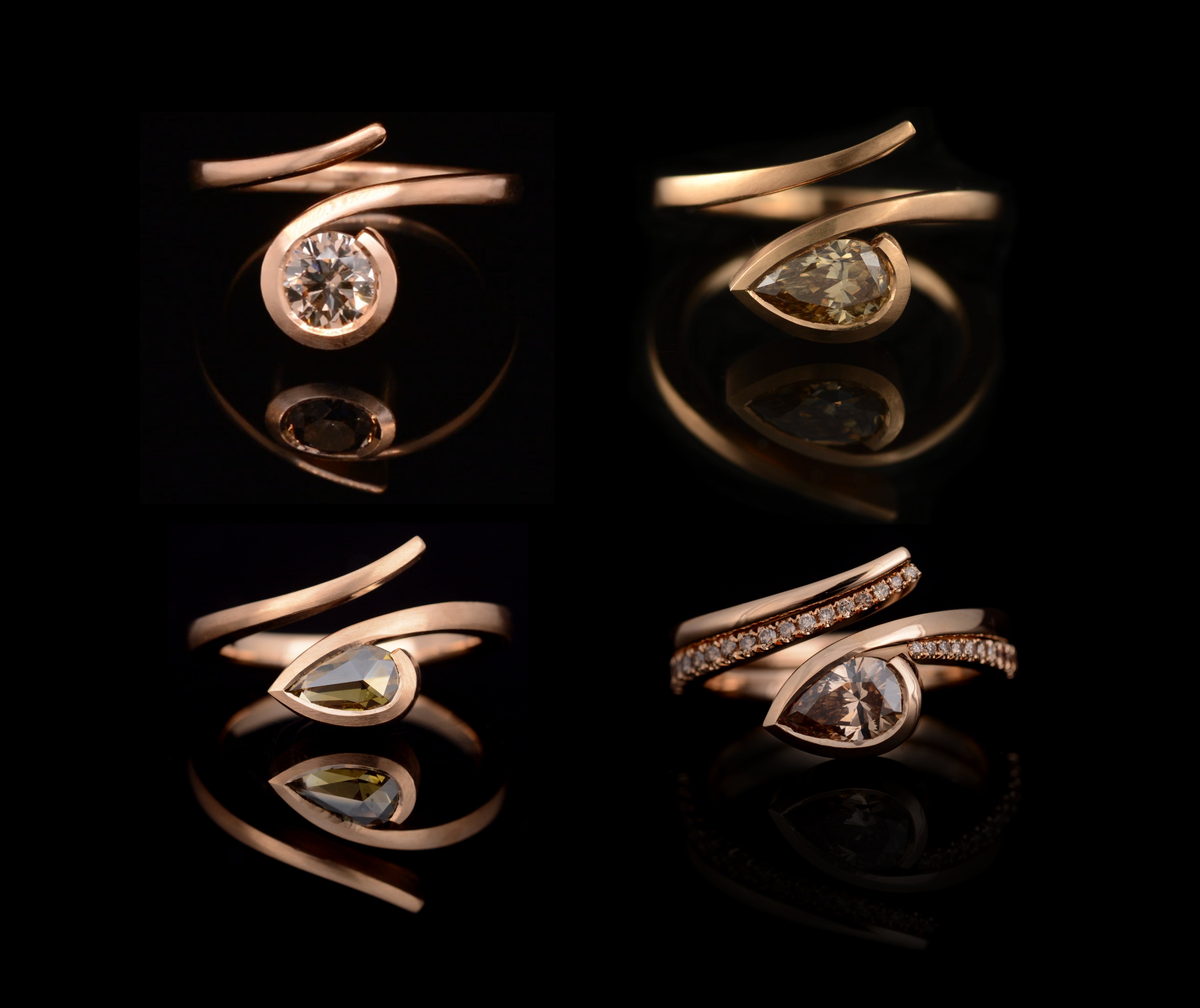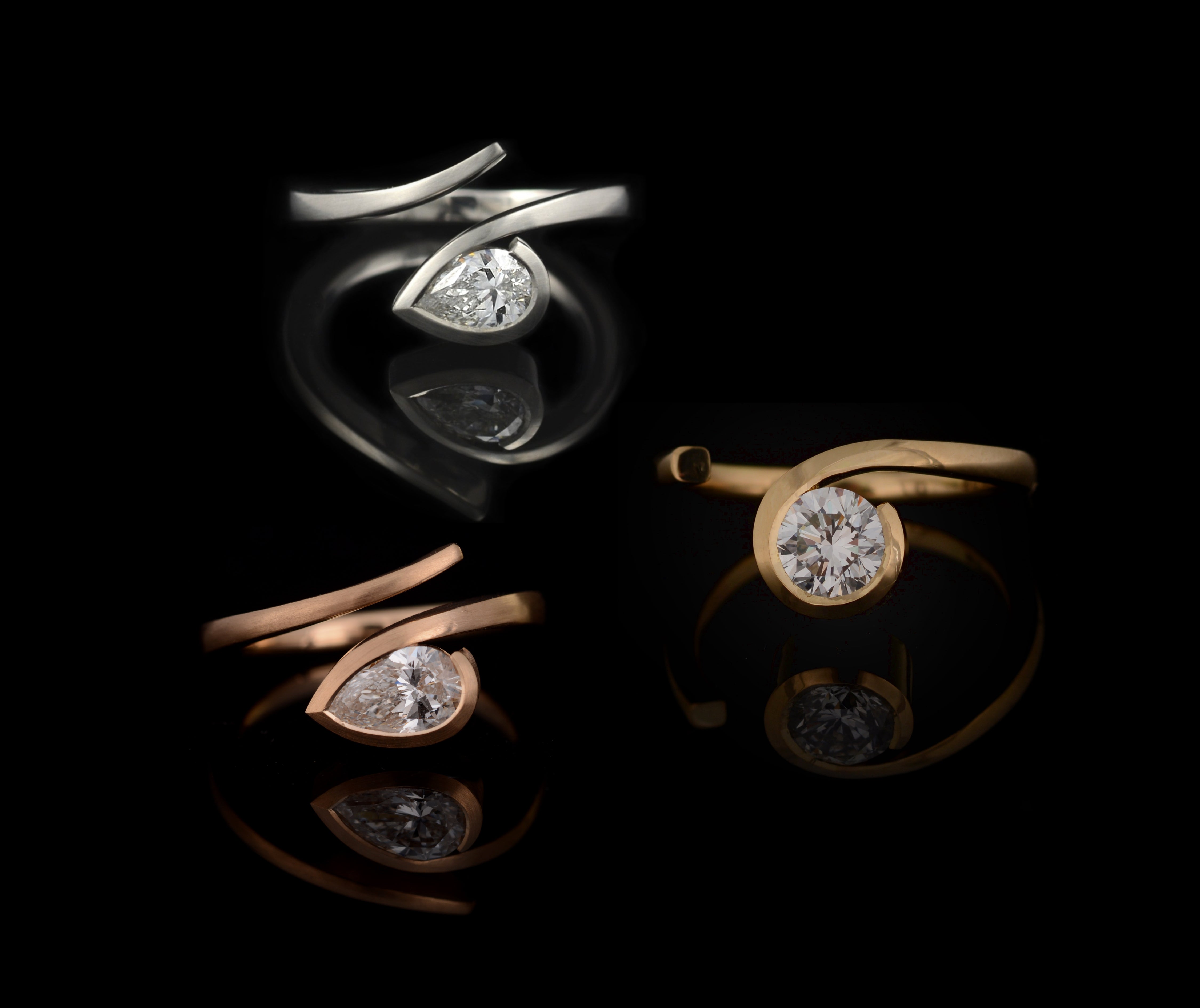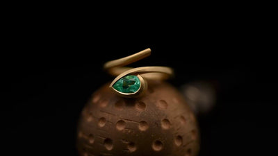 Starting with an 18ct gold or platinum bar and being forged by hand to create the soft curves of the twist, the metal is moved to mimic the shape of the stone and is then set in-house.