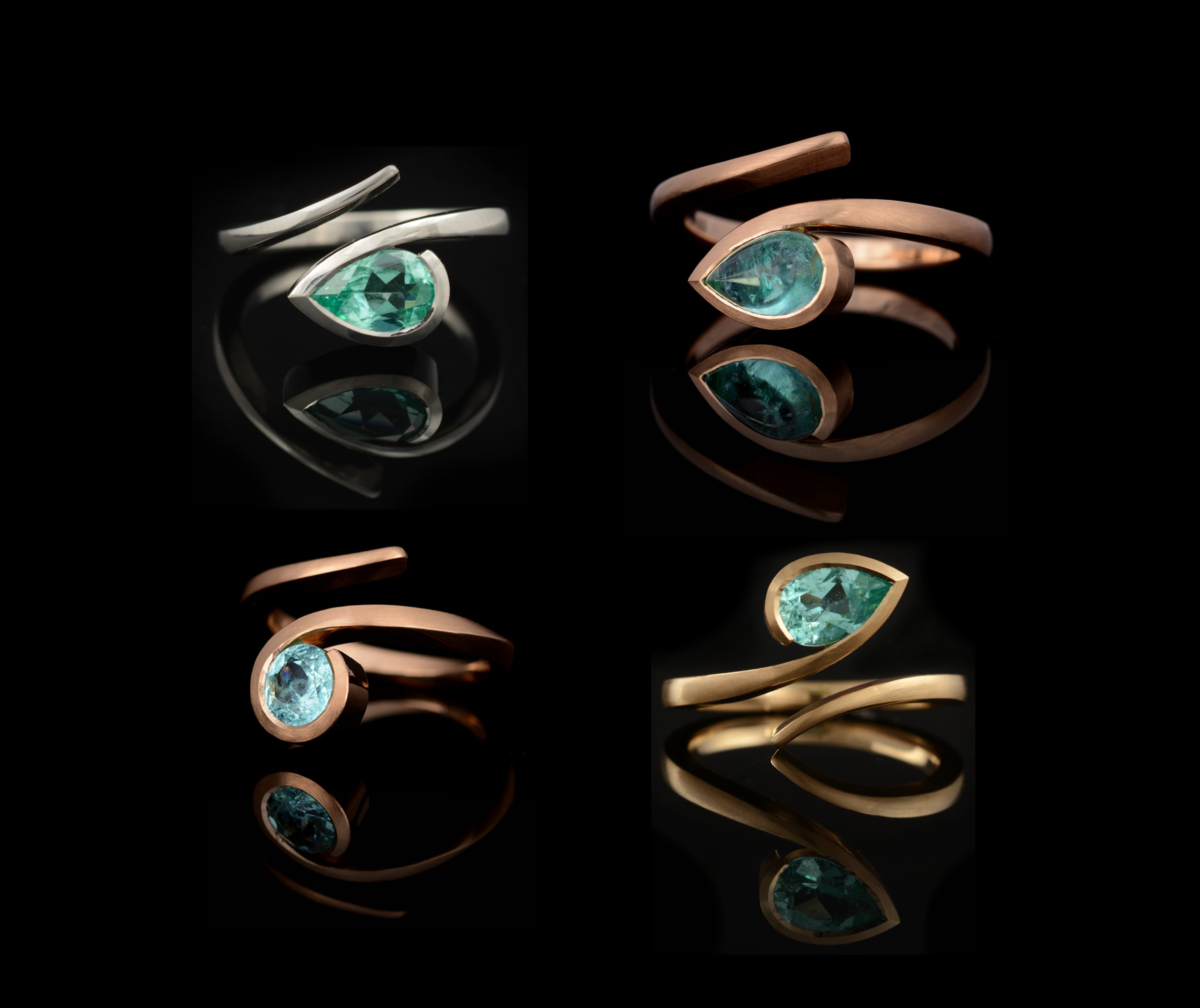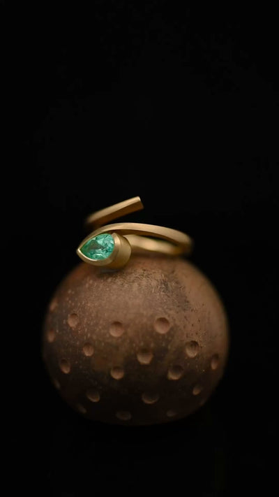 A modern yellow gold 'Twist' ring set with a stunning pear Paraiba tourmaline. Hand-forged from 18-carat gold bar, the ring tapers and twists around the finger to form an open band. At one end the pear Paraiba tourmaline is set in an open bezel, while the other end tapers to a delicate flick. The metal has been brushed to a soft satin finish, which emphasises the colour of the rose gold.