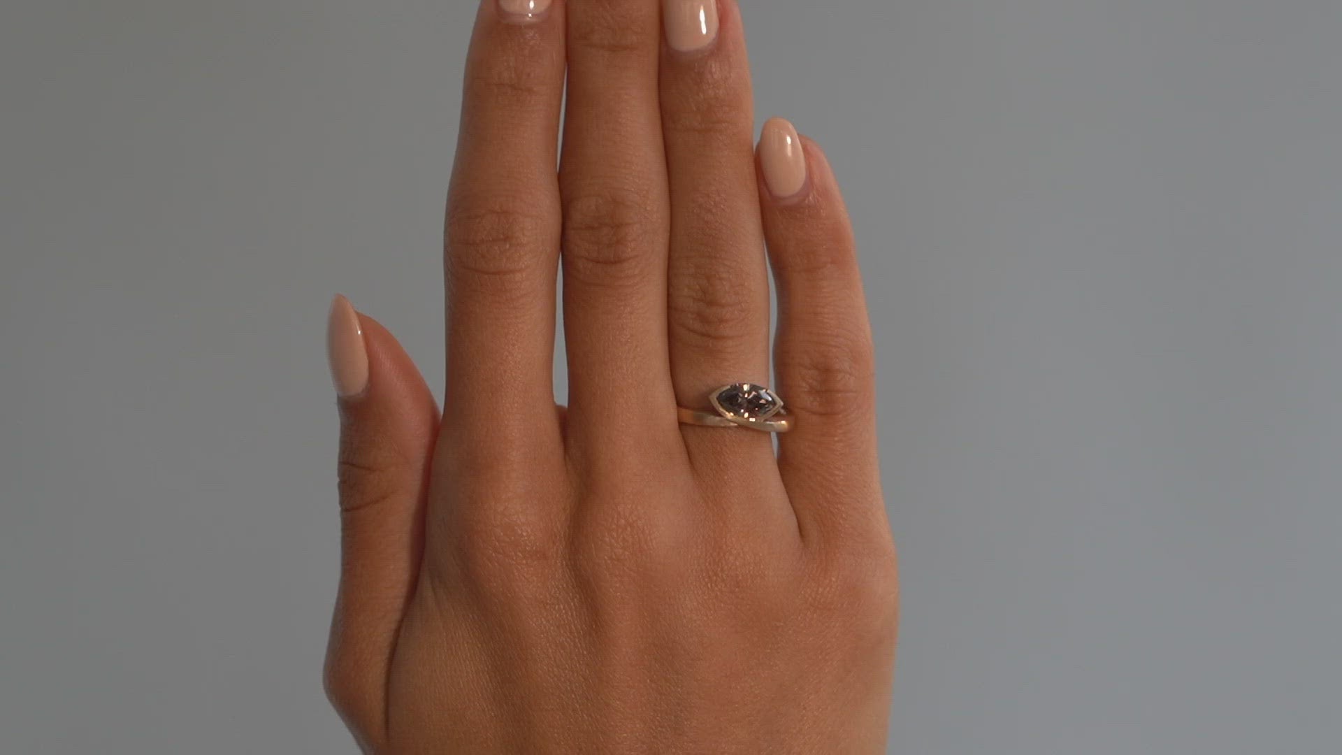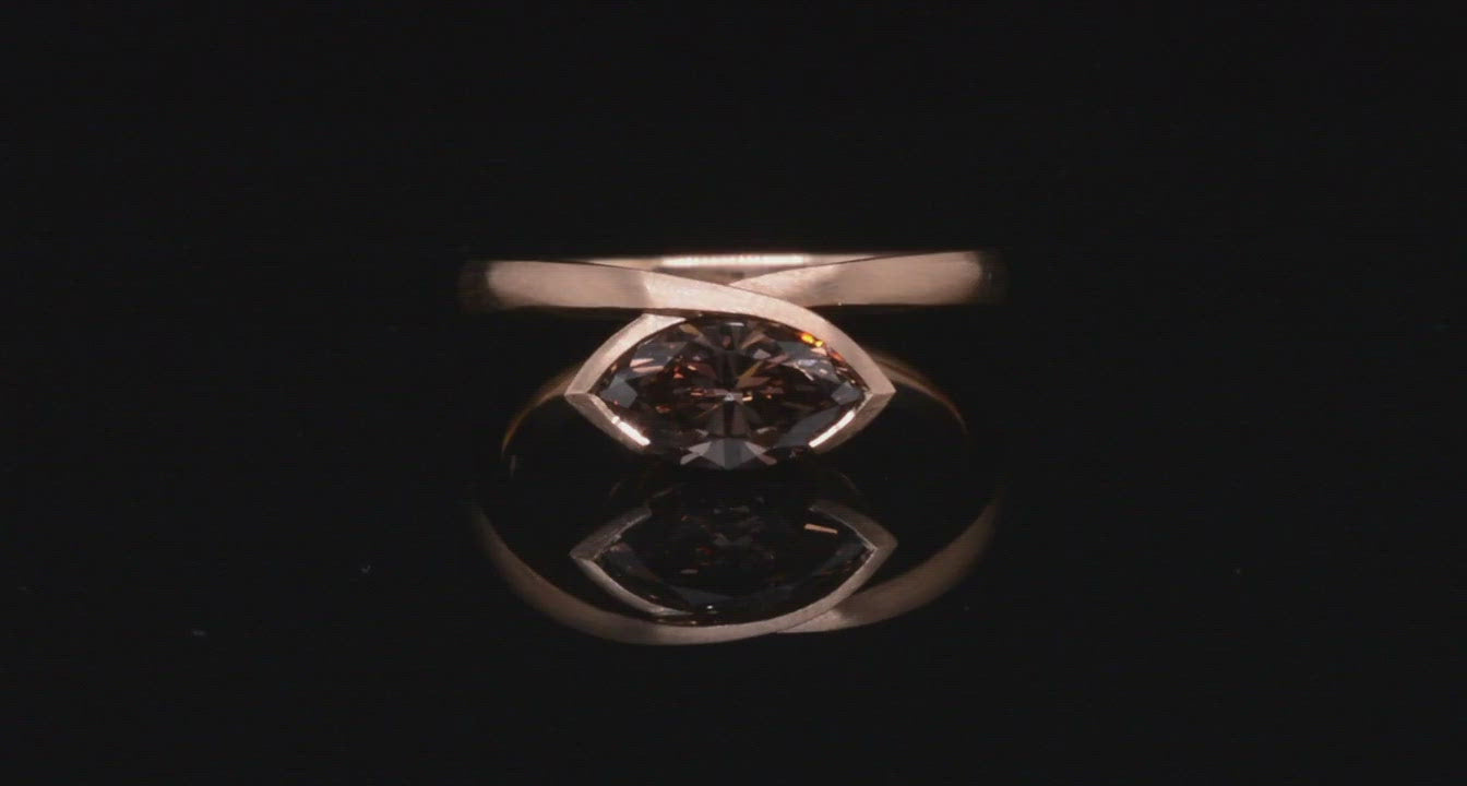 A marquise-cut cognac diamond bezel-set in an unusual and contemporary cross-over ring design. Warm rose gold perfectly complements the rich tones of this .9ct diamond. Made and set in our workshop using traditional and modern goldsmithing techniques, the ring has been given a soft satin finish to emphasise the flowing line and create a modern classic. This design is equally suited to wear as a dress ring or an engagement ring and can be worn with a fitted band.