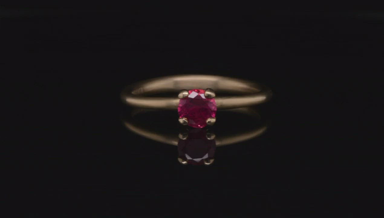 A sculpted variation on the classic four claw solitaire ring. Gently curved and sculpted claws give this ring an organic quality and bring a fresh, modern feel to a classic design. Seen here in satin-finished yellow gold, set with a round .5ct ruby.