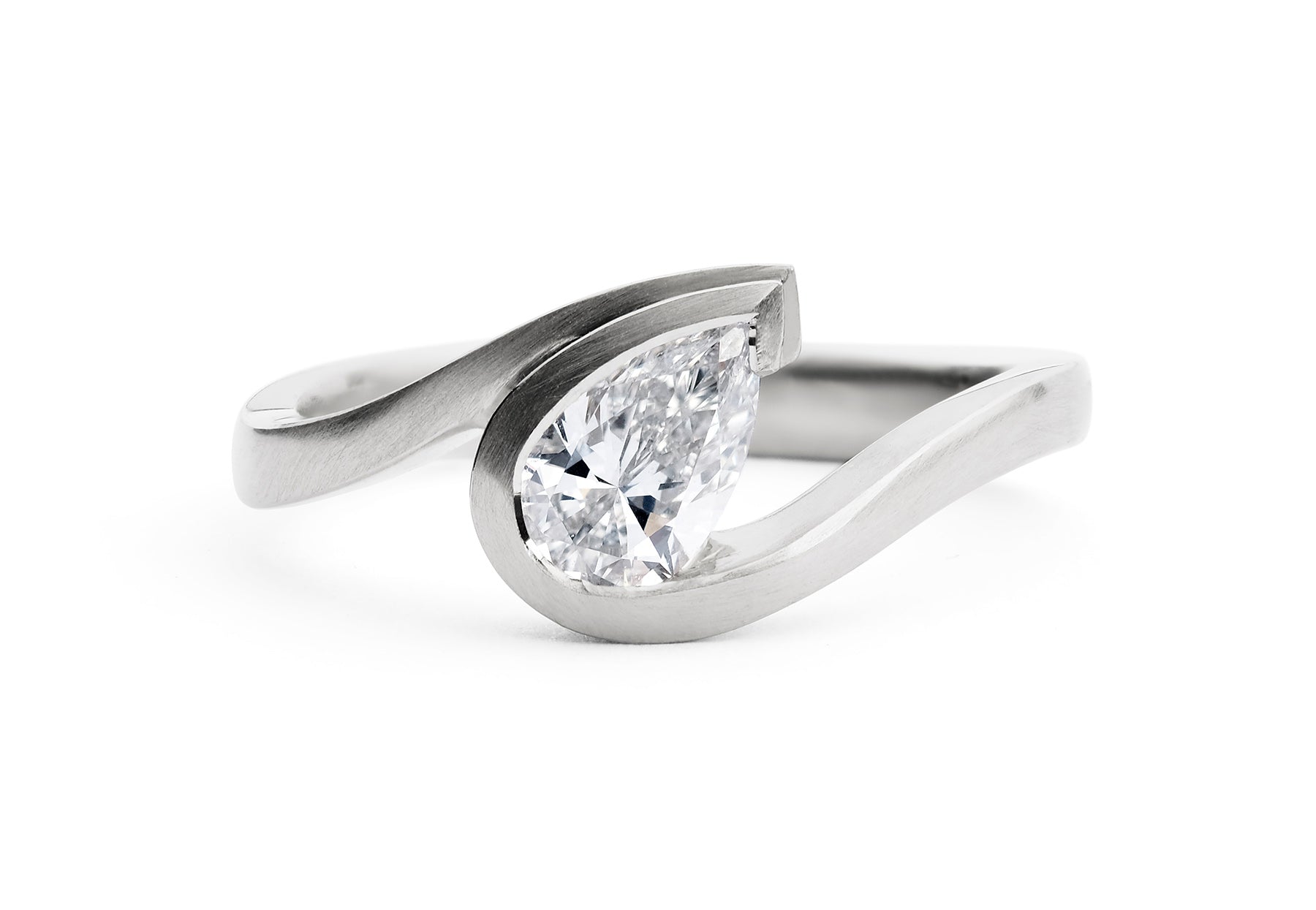 The Wave Platinum Pear-Shape Diamond Engagement Ring is the perfect unusual engagement ring idea for modern women. The 0.5ct pear cut white diamond is set in our signature satin-finished platinum, a well proportioned stone for the design of this ring. This contemporary, asymmetric and curvaceous solitaire engagement ring is crafted to last generations. The nearly full chunky bezel setting protects the diamond making it perfect for everyday wear.