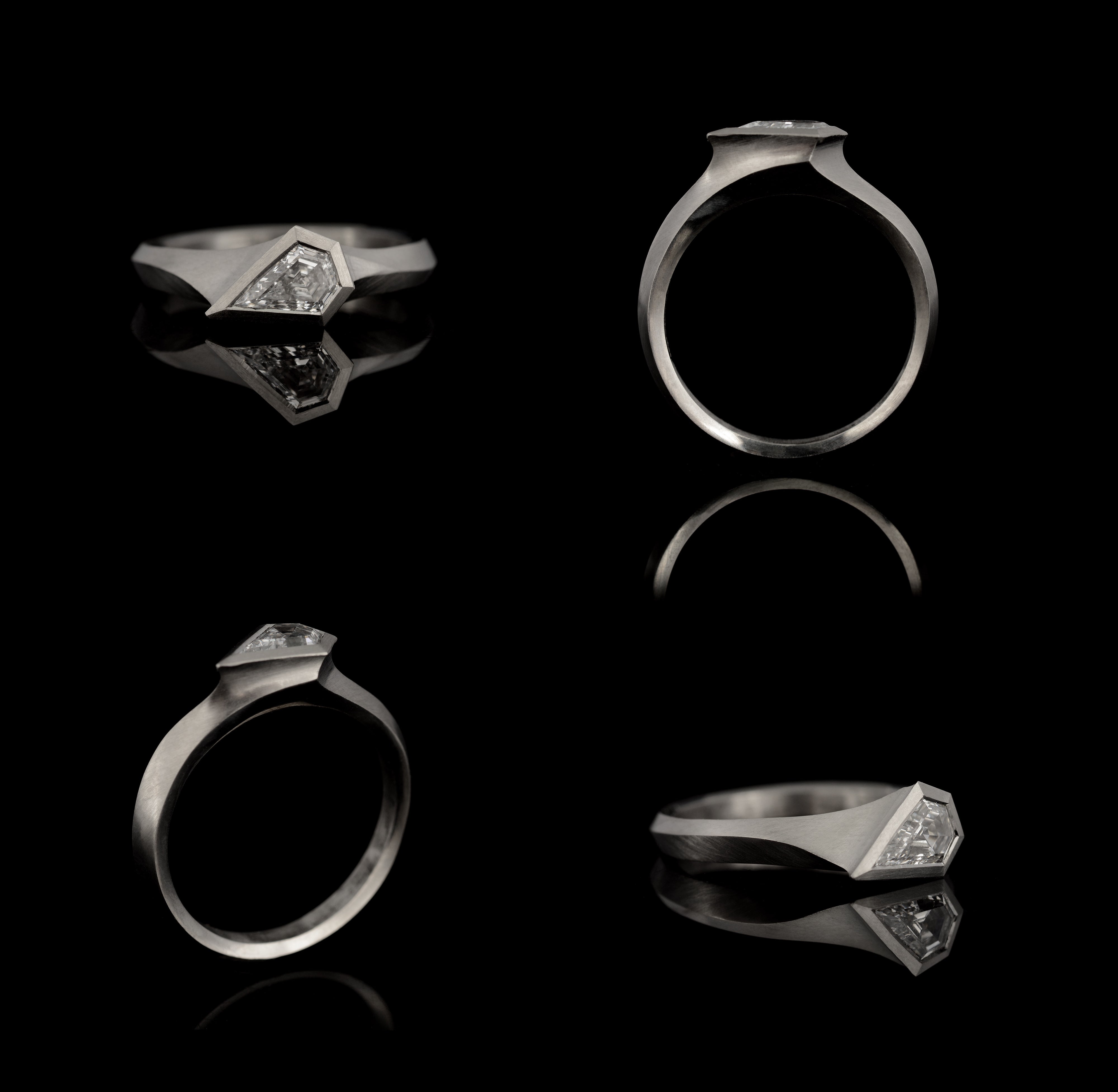 Seeing these stunning and unusual shield shaped diamonds, we created a new design that is focused on the stones and accentuating their sharp lines and mesmerising sparkle.