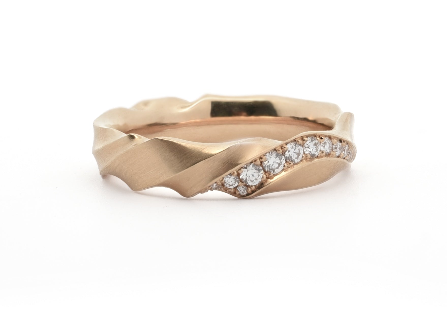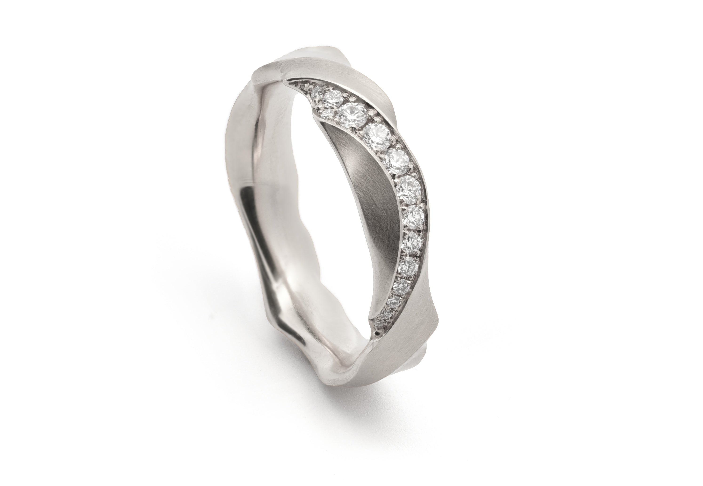 A delightful diamond addition to our ripple band offering. Hand carved, these rings are sculpted in wax before being cast into precious metal. The curves are accentuated with a sweeping curve of pavé set white diamonds. The soft matt finish accentuates the undulating surface curves around the ring. The ridges are delicately polished to add more detail to the texture of the ring.