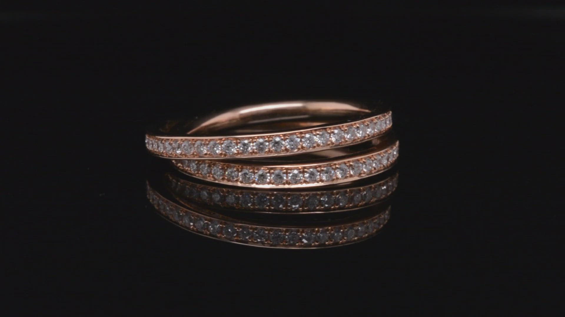 This stunning rose gold dress ring is hand made from a continuous looping piece of 18 carat rose gold, and pave set with over 80 glittering diamonds which create a line of light around the ring. The diamonds combine to give a total weight just shy of one carat. This classic design is equally suited to wear a dress ring or as an alternative to a traditional wedding, engagement or eternity ring. Pictured in rose gold with champagne stones, this ring can be created in white, yellow or rose gold or in platinum and set with white, champagne or cognac diamonds.