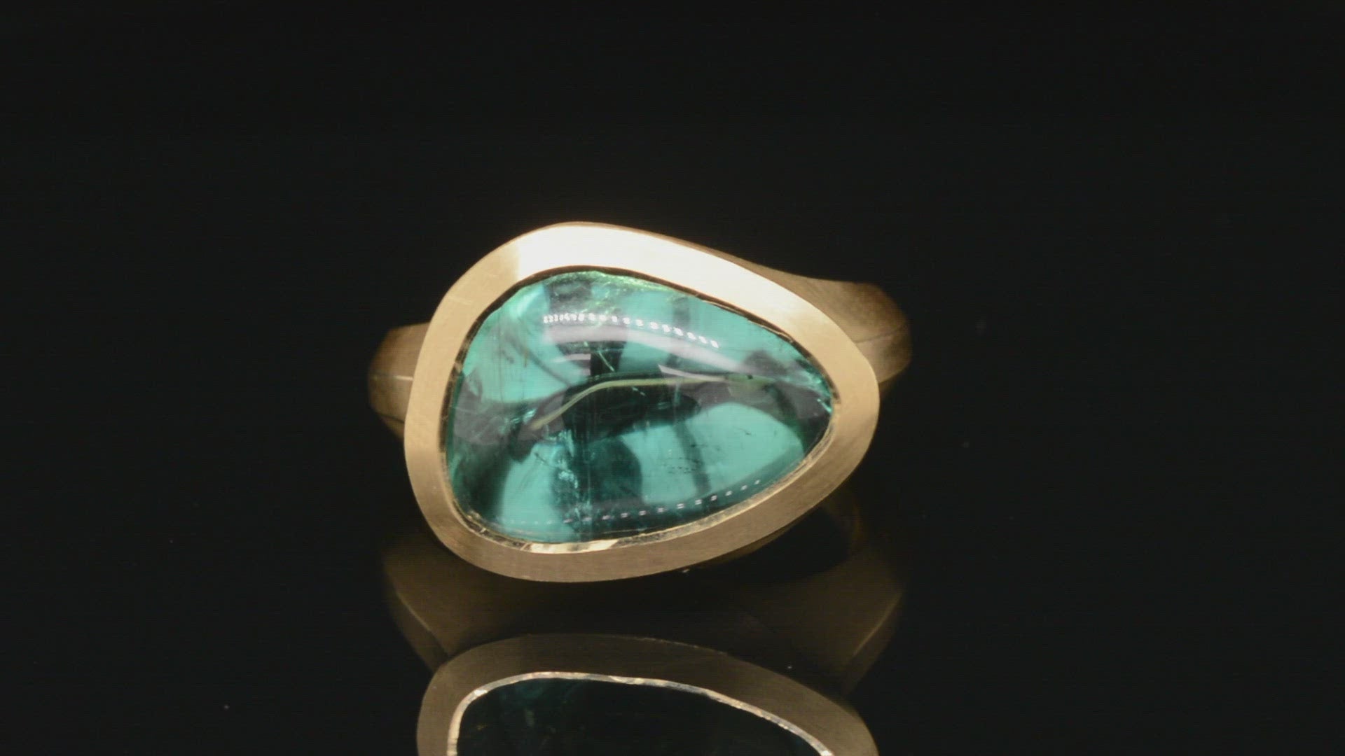 Satin finished yellow gold is paired with a 6.73ct cabochon cut tourmaline in this sculptural cocktail ring. Part of our Arris range, this ring is hand carved to fit its unique gemstone perfectly. The fancy cut tourmaline is a blue-green colour, which looks especially vibrant against the rich tones of 18 carat yellow gold.